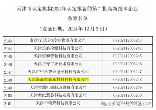 近日,從國家高新技術企業認定管理工作領導小組辦公室傳來喜訊,海晶集團旗下天津海晶惟鑫新材料科技有限公司(以下簡稱“惟鑫公司”)和山東海晶新材料有限公司(以下簡稱“山東海晶新材料公司”)成功獲批“國家高新技術企業”。同時,山東海晶新材料公司還首次入選山東省瞪羚企業名單。這是海晶集團在科技創新領域持續發力、深化布局的重要成果,标志着海晶集團整體科技實力與創新競争力的進一步提升。